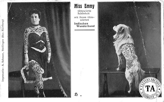 These were great spectacles in the tattoo world but few measure up to the 1906 German pitch card that shows Miss Emmy and her tattooed dog. Miss Emmy, a famous German attraction, is seen in several postcards and pitch cards from this era. The dog is posed for the camera with its front legs on a small table and has been shaved so that its back piece is clearly visible.
