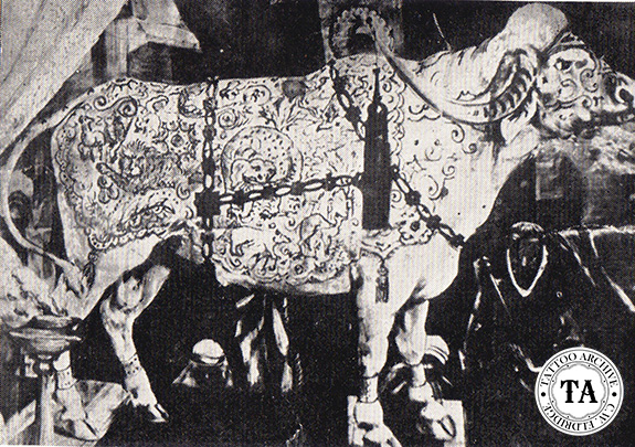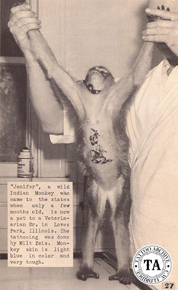 Besides marking animals for identification, some pet owners have taken it a more decorative level, tattooing their pets with attractive designs. Lyle Tuttle's dog Chadwick had a heart with the word mother tattooed on his inner thigh and Milton Zeis, in the 1950s, tattooed the monkey Jenifer with an anchor and ship on it's stomach. Frank Graf, a 1920s Coney Island tattooist, is said to have tattooed a cow which was displayed in the sideshow. And let's not forget the Tattooed Pig and Hairless Dog Project (1976-1984) created by Andy Feehan. Stanley Marsh III, a millionaire, artist, philanthropist, and prankster from Amarillo, Texas along with tattooist Randy Adams was involved in the hairless dog project. Marsh furnished the money and Adams the artist vision.