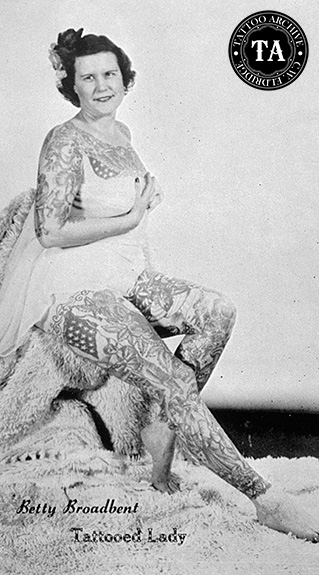 Betty Broadbent was born in 1909 and started her tattoo career in 1927 after receiving a tattoo body suit from Charlie Wagner and Joe Van Hart. Betty's first job was with Ringling Bros. Barnum & Bailey Circus (The Greatest Show on Earth) and from there, she spent the next 40 years in and around the show business scene. A long career for a female tattoo attraction was unusual, women in those days soon gave it up for easier work. But not Betty. As they say in the circus, Betty was 'with it and for it.'
