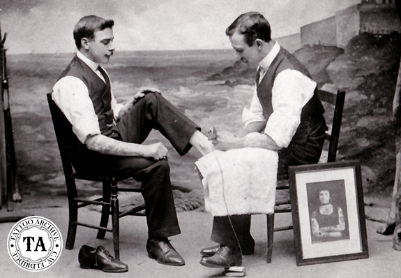 Charles Davis followed in his older brother's footsteps into the tattoo world, but never received the acclaim that George did. The brothers worked together at times and also operated shops separately for many years. George and Charles were just a few years apart in their ages. It's difficult to tell them apart in photographs today, with both of them dressed in white shirts, vests and ties, and sporting well-trimmed mustaches and matching shoes! They both even liked to work in white medical smocks. In later years Charles stepped away from tattooing, and in the 1950s George wrote that Charles was active in the insurance business.