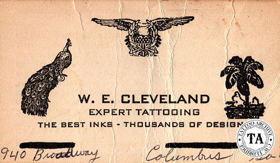 I believe that Walter was the oldest of the Cleveland's so we’ll start with him. Walter Cleveland (1887-1968) was a New Hampshire native. A 1943 news article in the Portsmouth Herald stated that he started tattooing by hand and took up the profession in 1909 in New York, and by 1916 he was using the electric machine. Today Walter Cleveland is probably best known for his years of tattooing in Columbus, Ohio, Georgia and Norfolk, Virginia. In Columbus he tattooed in at least three different locations on Broadway, #934-#936 and #940. In Norfolk it is thought that he worked with Jack Wills on East Main Street.