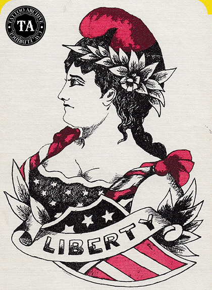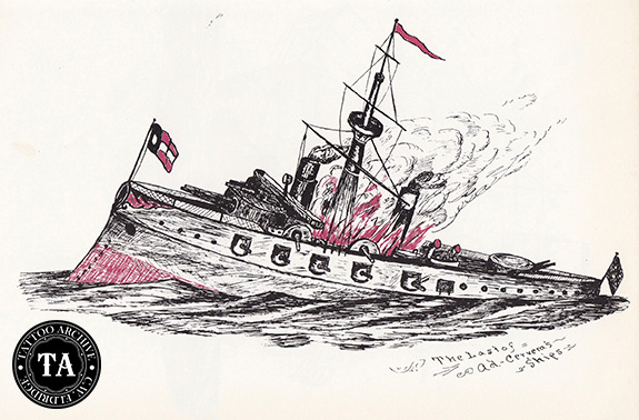 Not very much was known about tattooist C.H. Fellowes before Carmen Nyssen started her research. Carmen is a very diligent researcher and we are proud to have her associated with the Tattoo Archive. All that remains of C.H. Fellowes is his sketchbook and a hand tattooing kit, found in 1966 in Providence, Rhode Island and later sold to a private collector. That same sketchbook and kit was donated to the Mystic Seaport Museum, in Mystic, Connecticut. C.H. Fellowes’ sketchbook, The Tattoo Book was published in 1971 by the Pyne Press and is an interesting study of turn-of-the-century tattoo designs, mostly in black and red and featuring patriotic, religious and nautical themes. On the cover of Fellows’ sketchbook, embossed in gold letters is the name Warner Locks-C.E. Stumcke. In Carmen’s research she found Charles E. Stumcke was a Boston resident who was a buyer for Bigelow and Dowse Hardware at #229 Franklin Street in Boston. It appears that Stumcke had bought or was given the blank sketchbook by Warner Locks Hardware Company. These answers the question of where the sketchbook came from, but how did C.H. Fellows the tattooist end up with the embossed blank sketchbook? Come to find out that the Bigelow and Dowse Hardware Company had an employee names Charles H. Fellows. The final clue was in Fellows’ artwork itself. The sketchbook had a design with a ribbon and the initials G.W.B. in the ribbon. In 1895 Fellows married Jennie W. Baker. Carmen thought that Jennie could be short for Genevieve. Sadly she died the same year they were married. Other designs in Fellows’ sketchbook contained a ribbon with the initials C.A.S. In 1898 Fellows married Clara A. Steele. Lucky for us Fellows added some personal touches to his flash.