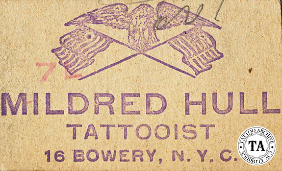 From the 1840s up to the 1960s (when tattooing was banned in New York City), the Bowery and the City itself was a Mecca for tattooing. The list of tattooists that worked there reads like a Who’s Who of the tattoo world. Many tattooists during those years were just passing through the City, but a few stayed and made it their home. During this time the tattooists were almost all men. Mildred Hull was the one major exception. Affectionately known as Millie, she was one of the few women to work on the Bowery in New York City. Her #16 Bowery shop was located in a barbershop. Several New York City tattooists worked like this, including Charlie Wagner. Old time tattooists were famous for setting up in closet-sized locations in arcades, under stairways, and even in horse-drawn wagons. A barbershop with a clean space, a male customer base, and a corner for rent was reason enough.