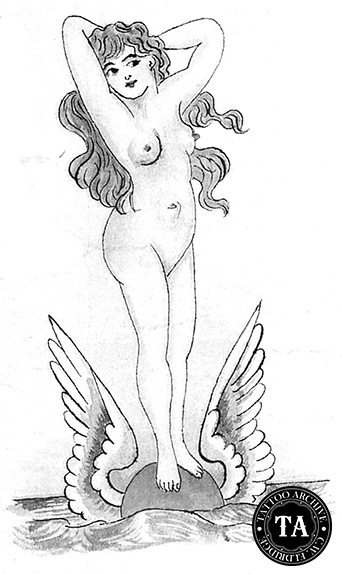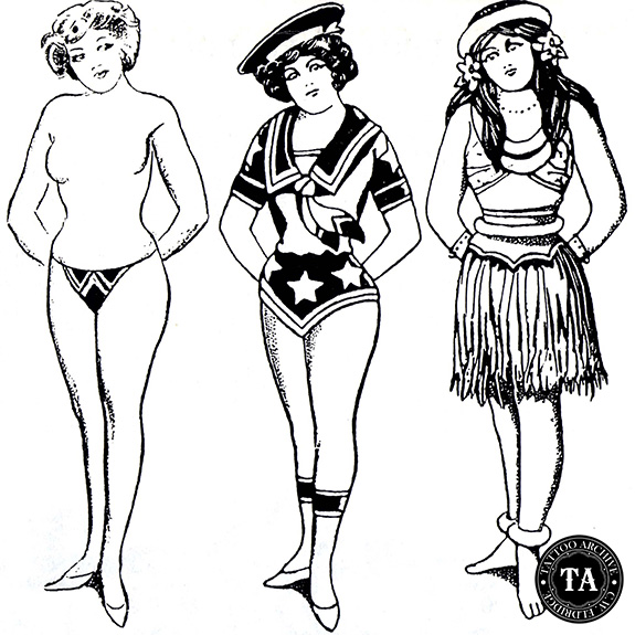 In the 1940s this obscure ruling caused one of the biggest booms the tattoo trade had known in years. From far and wide, eligible young men flocked to their favorite tattooist with demands for lingerie, skirts, brassieres, fans, bubbles, flowers, and butterflies -- almost anything that would cover up a bare spot.