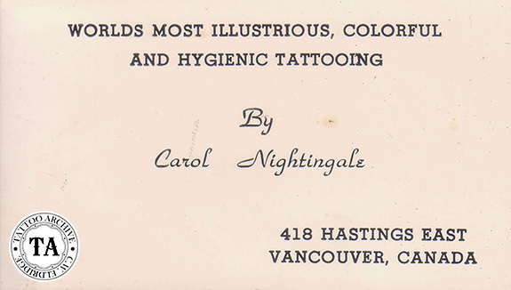 Carol Nightingale, a Canadian, tattooed in Alliston, Ontario and in Vancouver, British Columbia at #418 Hastings Street East. He relocated to the United States in 1965 and set up shop in the nation's capital, Washington, DC at #900 Twelfth Street NW where he built a very unique shop. To enter you would push the buzzer wherein he would come to the door and ask you what you wanted. If you answered incorrectly, he would ask for an admission fee (on my first visit it was $10.00). Once these formalities were over you would go inside. Nightingale tattooed in a metal cage, often with a dog in there with him. His shop was in a rough section of DC, just across the street from the bus station, so his security was above the norm.