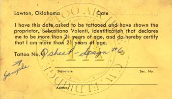 Modern tattoo history since the 1900s in Oklahoma is spotty. Oklahoma City had Leon and Bob at 419 West Grand. In the city of Lawton, a tattooist working under the name Stubby was located at 1415 South Second Street. Fred Musselman and Sebastiano Valenti also worked in Lawton, but their addresses are unknown. In the book Life as a Sideshow Tattoo Artist, Stoney Knows How by Alan Governor, Stoney St. Clair talks about an Oklahoma Indian tattooist named Chief Many Ponies. Unfortunately the Archive does not have any information about him.