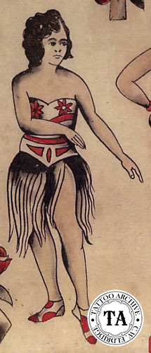 In a 1977 interview, Bert Grimm accurately summed up what he thought men were looking for with pin-ups. "They wanted the girls to have enormous but shapely and protruding breasts. They wanted something to turn them on. They wanted erotic, not to say obscene, designs of women of all races and occupations, including ones of Red Cross nurses, the Statue of Liberty, and an oversexed Amelia Earhart. Some men had nude hula girls strategically placed on their biceps and when the guy moved his arm muscle in a certain way, the gals hips would wiggle and her breasts would bounce. Sometimes the guy would whistle a tune to go along with the dance. I used to have about 15 sheets of girlie stencils hanging up, now I have only two. I took the other ones down because they don't sell".