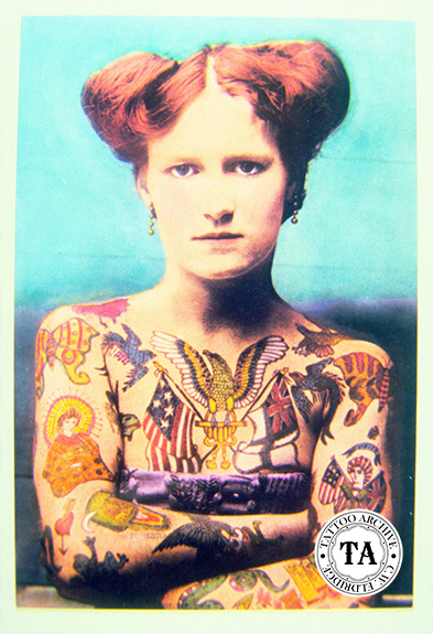 Early on, tattoo artists and attractions realized the publicity value of the picture postcard. Most attractions sold postcards showing their tattoos and many realized a big profit from it. Betty Broadbent was always very careful to retain her right to sell photos of herself in her contract negotiations. Sideshow operators were very aware of the money to be made by attractions selling cards and at times would try to horn in on the money.