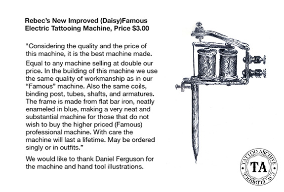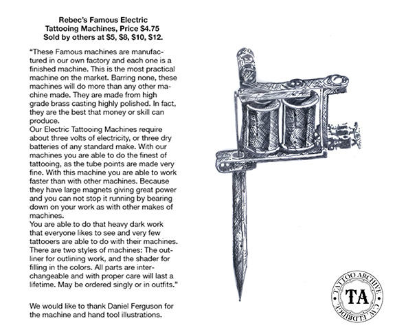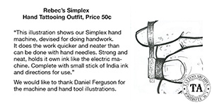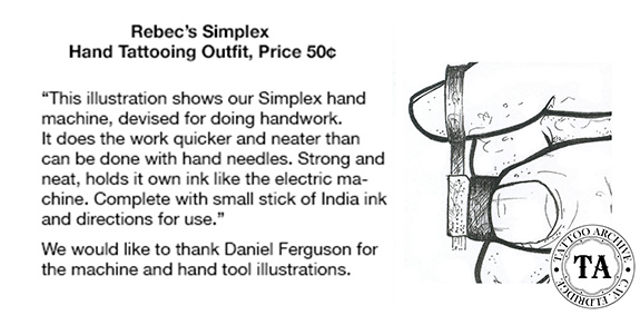 Rebec’s also carried a couple of different styles of hand tools. One was a traditional bone handle outfit including designs, stencils and stencil power, stick of black ink, ¼ oz. of red pigment and a book of instructions, all for $2.50! Rebec’s also sold what they called the “Simplex” hand-tattooing tool. This was a sliding metal device that was held between your thumb and middle finger while your index finger is placed into the metal loop and the needles move up and down with the movement of your index finger.