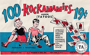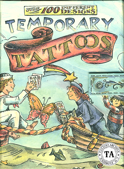 The early history of temporary tattoos is vague. However, by the turn of the century temporary tattoos or transfers were beginning to appear. Surely the first ones were the food coloring style that could be easily transferred with spit or water. It is possible that Cracker Jacks® was the first to circulate these transfers. The popcorn and peanut confection was introduced to the public in 1896. In 1912 "A Prize in Every Box" was introduced when toys were inserted into every package. Some of the early prizes could have been temporary tattoos. Today Cracker Jacks® include food coloring style tattoos as prizes in their snack. In the 1950s, sheets of these food-coloring designs were sold for 1 cent each. I remember them from my childhood in North Carolina.