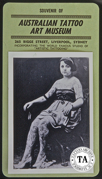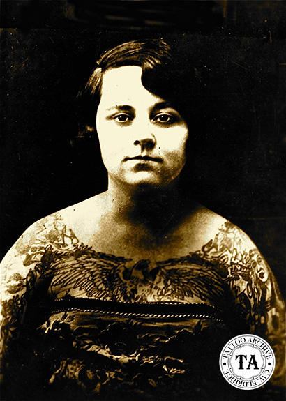 Mae found a boardwalk tattooist and got a butterfly tattooed on each shoulder. As fate would have it, Mae met Victoria James who was also known as Miss Pictoria. Miss Pictoria convinced Mae to become a professional tattooed lady and off they went to see Charlie Wagner. Wagner tattooed May and she started playing Coney Island shows. She took the stage name Miss Artorio and eventually graduated to working with the Ringling show in the late 1920s.