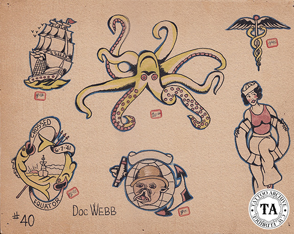 I have been tattooing over 40 years. Originally, I was a commercial artist working for the Fox West Coast Theaters. I also worked for the arcades doing signs with comic sketches on them. I met Bob Kelton and other tattooists in the arcades and they asked me to draw designs for them. I got 50¢ or 75¢ a design. One day they asked me to put one on a customer. I did and I liked it so well , I got right into the business. Haven't done anything else since". ("Doc" Webb)